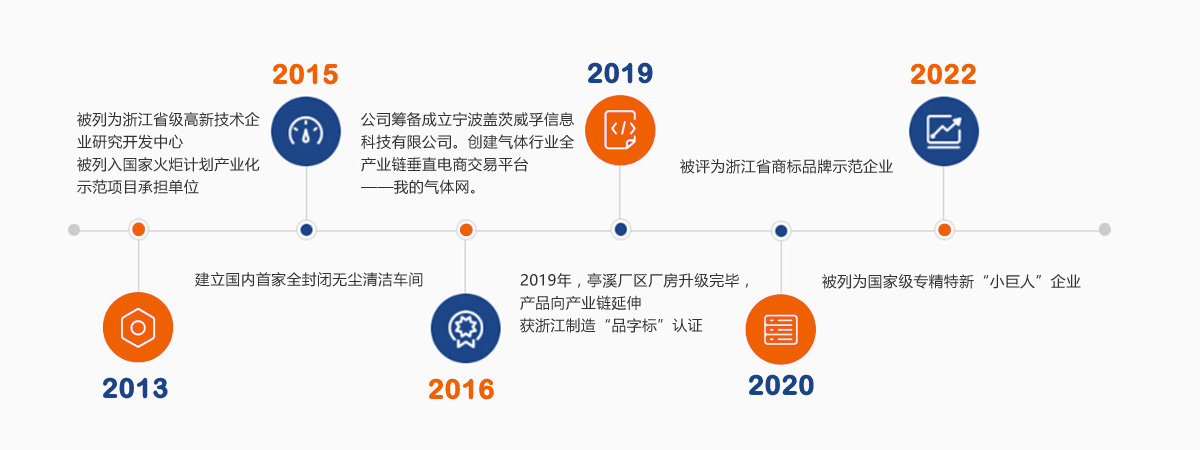 2016:公司籌備成立寧波蓋茨威孚信息科技有限公司。創建氣體行業全產業鏈垂直電商交易平臺——我的氣體網。